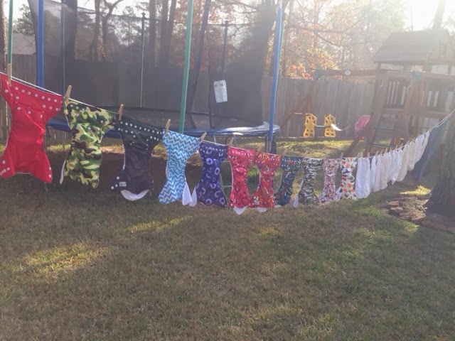 I ended up ordering 20 diapers from www.alvababy.com. Their prints are adorable and each diaper with 1 insert averaged a little over $5 each! Oh yeah finding cute prints is quite addicting. I mean who doesn't like making their baby's hiney look cute? I was expecting it to take 2-3 weeks to receive my order. I ordered around the holidays and even though I qualified for free "express" shipping I figured I was in for a long wait. To my surprise I ordered on a Tuesday night and they showed up Friday afternoon!! Expecting a long wait and knowing I ideally wanted more than 20 diapers so I could a. Have the option to wait longer between washes and b. Have more diapers to rotate to keep them from wearing out quickly (oh that's another perk, used cloth diapers can be resold! And typically for about 75% of what you paid for them if you take good care of them). Anyway I started looking on my local craigslist to see if anyone had a good price on diapers. I found a lady who had just potty trained her son and was starting to sell off her stash of 60+ diapers (at first I thought holy cow that's. A lot of diapers, but now I understand how addicting buying cute diapers is). She was selling another affordable (direct from China) brand I was considering called Sunbaby. What I liked about Sunbaby is they were created by a stay at home mom who like me was looking for an affordable way to diaper her child. They have a small factory with fair labor practices. I like the idea of supporting a fellow mom. Anyway I was able to buy 19 Sunbaby diapers with 2 inserts per diaper and half of those inserts were a bamboo blend (more expensive) as well as a name brand pail liner for $100. Yes I know that still breaks down to about $5 per diaper which is what I paid new however the extra inserts made it a sweet deal. If you have a heavy wetter or for night or nap time you want to double up on inserts for extra absorbency. Plus the pail liner alone retails for $18. The diapers were only about 6 months old and rotated in her huge stash so they were in great shape. I followed used diaper prepping instructions and voila I know have a stash of 39 diapers. Which means I can nearly go an entire week without HAVING to wash diapers. With that said I wash at the end of every 3rd day. For one the diaper pail (a kitchen trashcan) gets full and two lets face it a pail full of dirty diapers doesn't always smell very pleasant after it has been sitting awhile. I throw the diapers in the wash before I go to bed which doesn't interfere with my daily laundry and then hang (yes I said hang) them out to dry the next day. For one hanging them out saves energy and for two it helps keep the leg elastic from wearing out too quickly. At first I hung them over my dining room chairs to dry, but finally convinced Eric to buy me a $14 retractable clothesline so I could hang them outside to dry. The sun is also good for bleaching out any stains that may occur. I will say cloth diaper fabric is really stain repellent though.